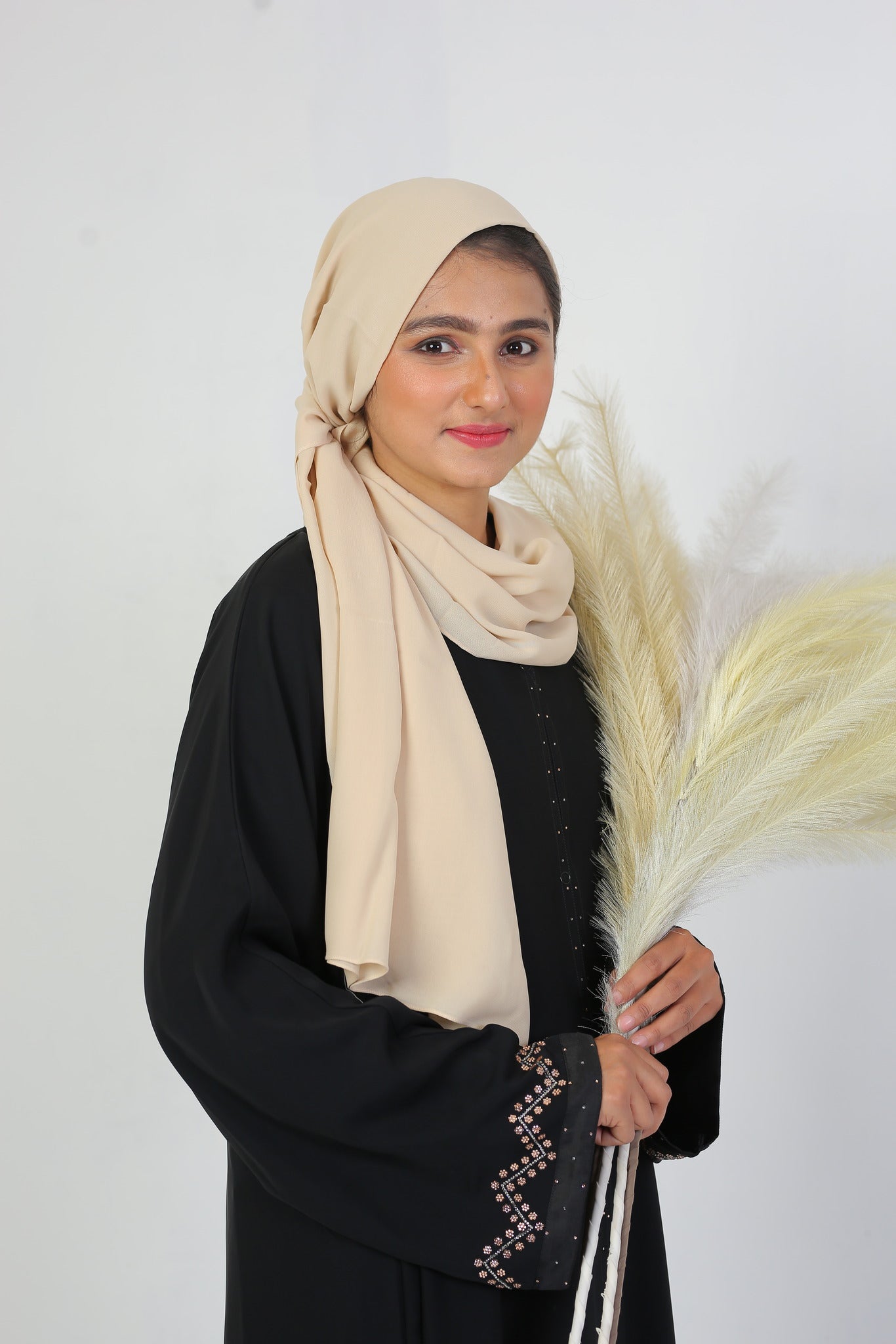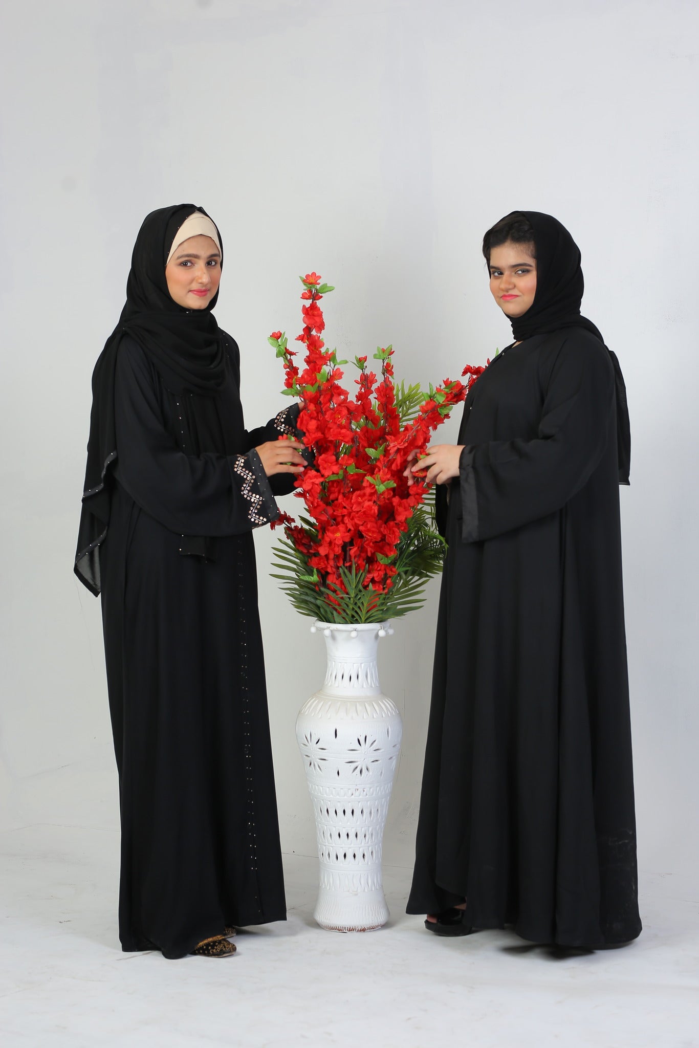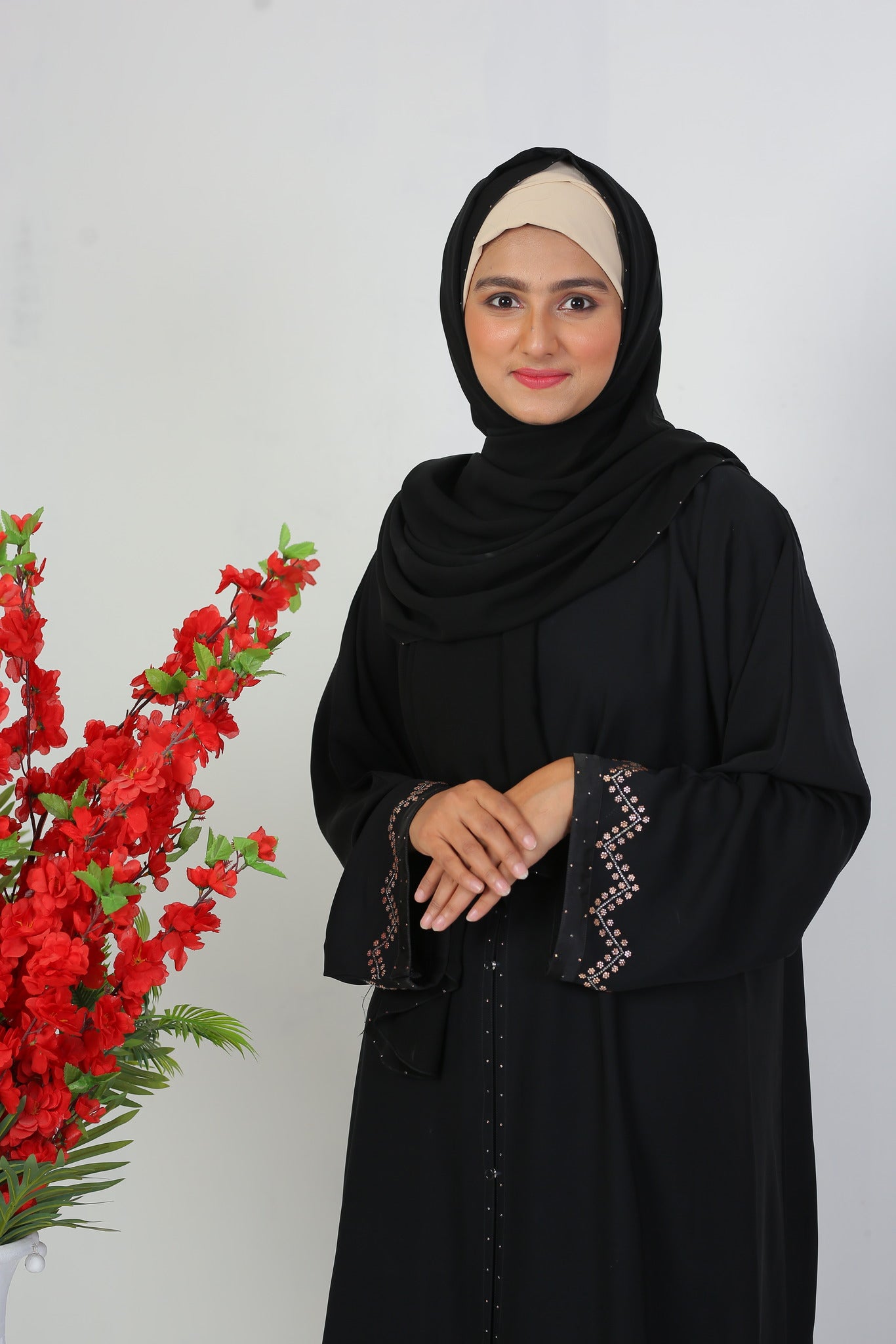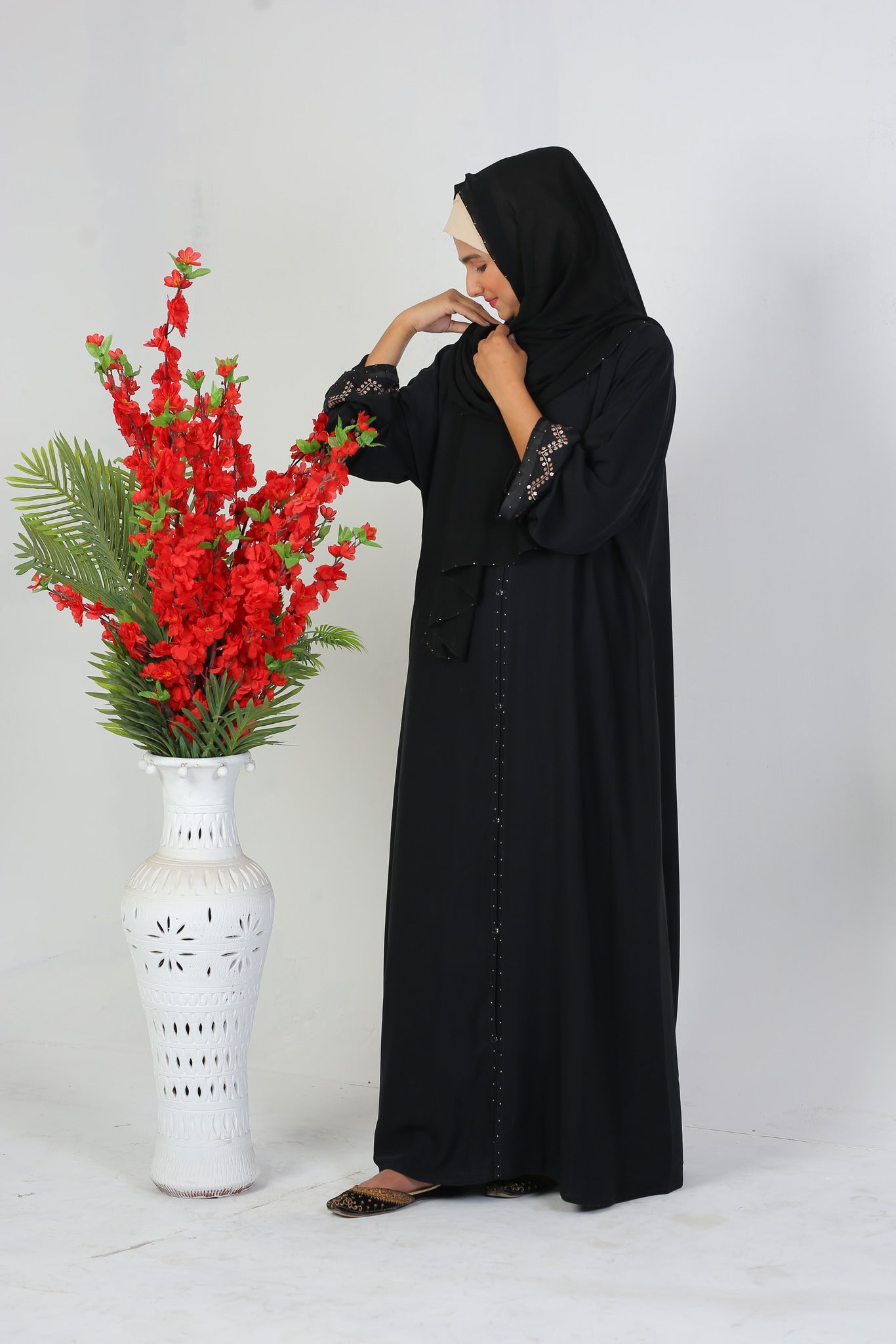 Step into the realm of elegance with our Embellished Black Abaya. The timeless black hue sets the stage for this front open design, adorned with exquisite stone work on the sleeves and front. The fine silk finishing of the sleeves adds a touch of luxury to this festive ensemble. Crafted from imported Nidha fabric, it merges opulence and comfort seamlessly. Whether it's a grand celebration or an intimate gathering, this abaya effortlessly fuses modern style with classic charm, making every moment truly special.