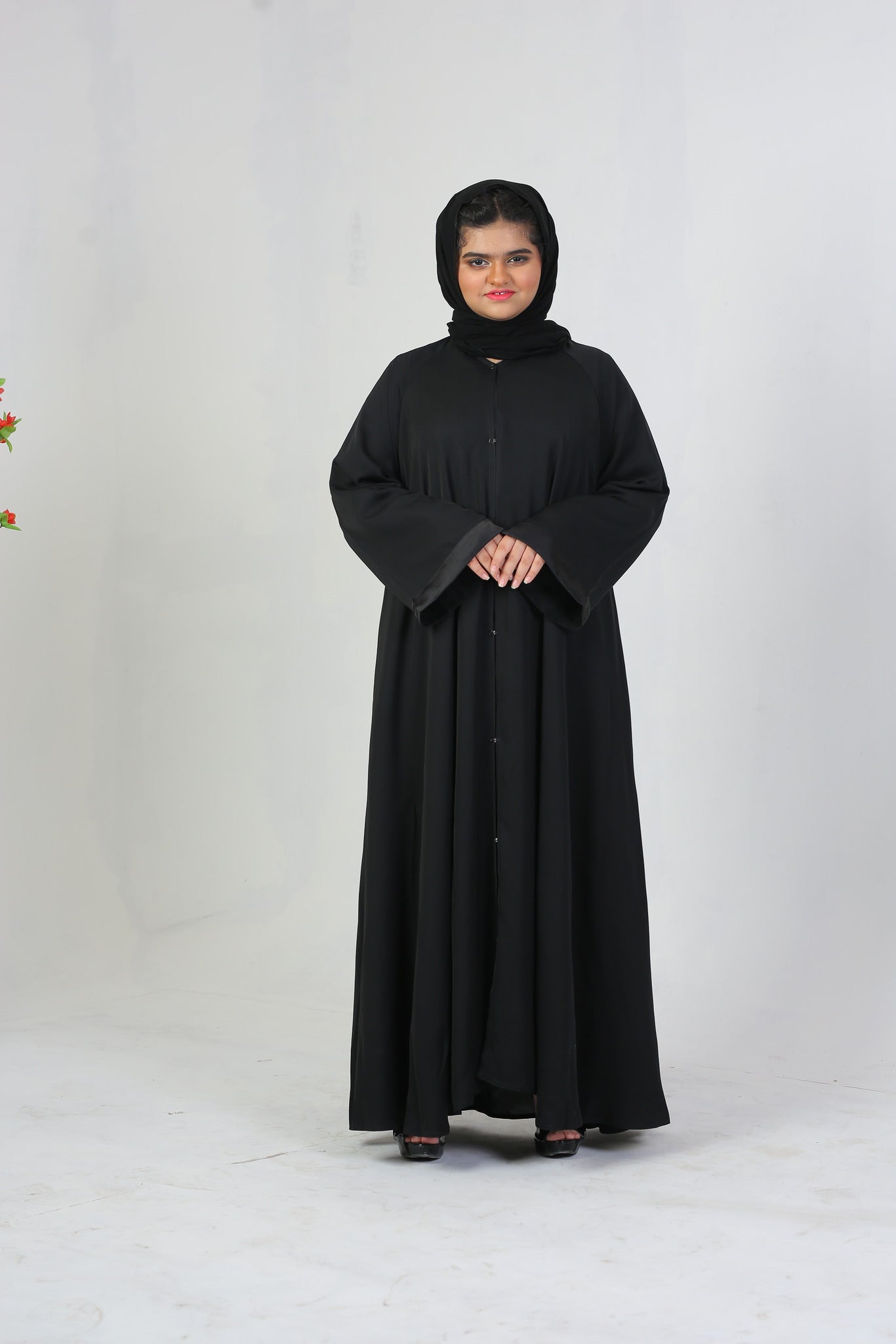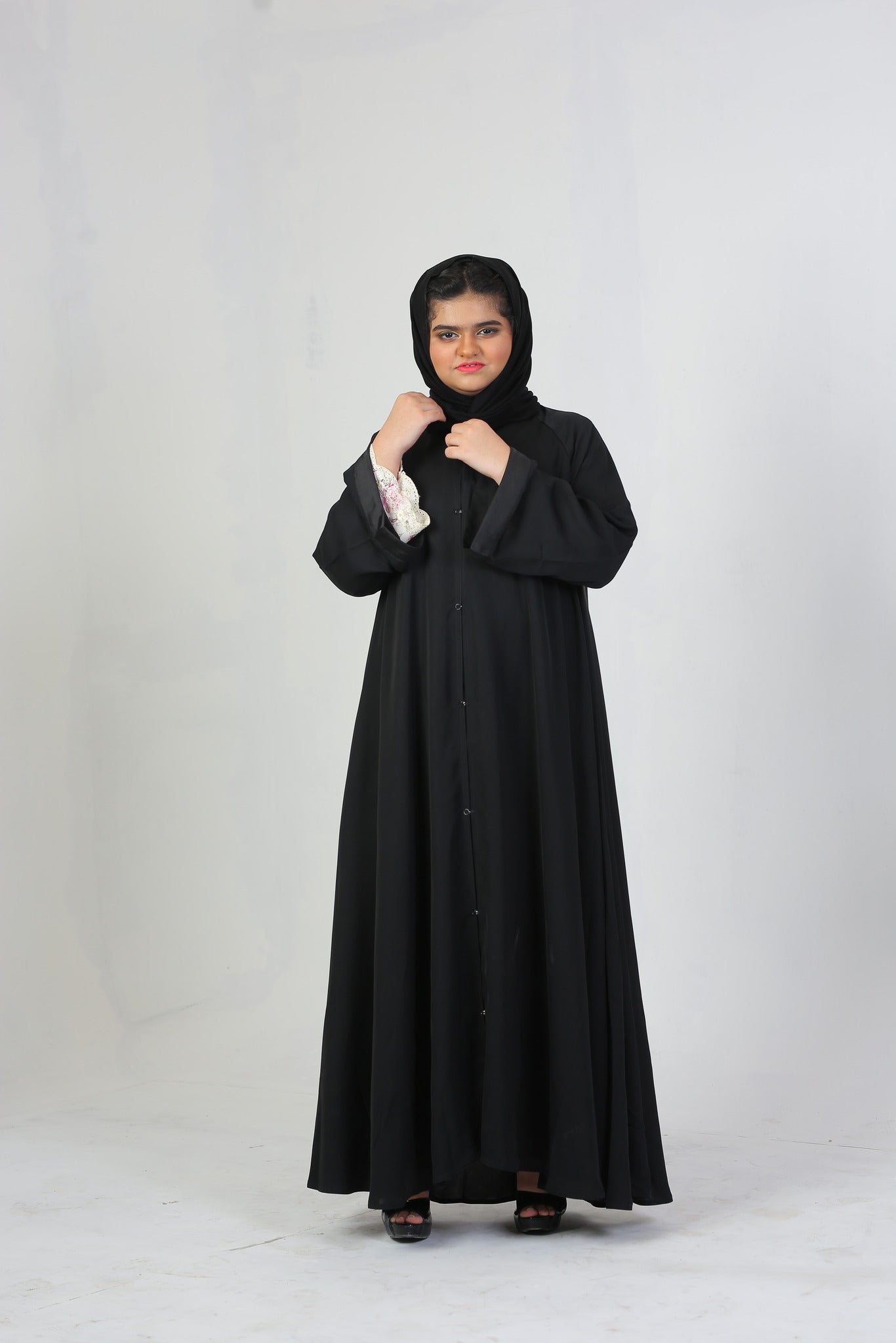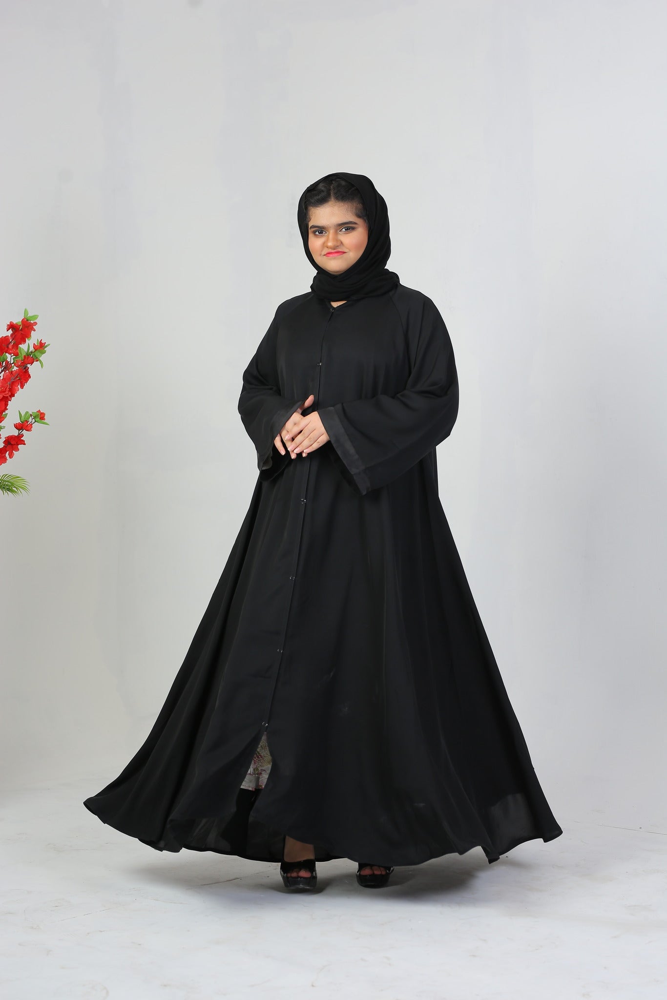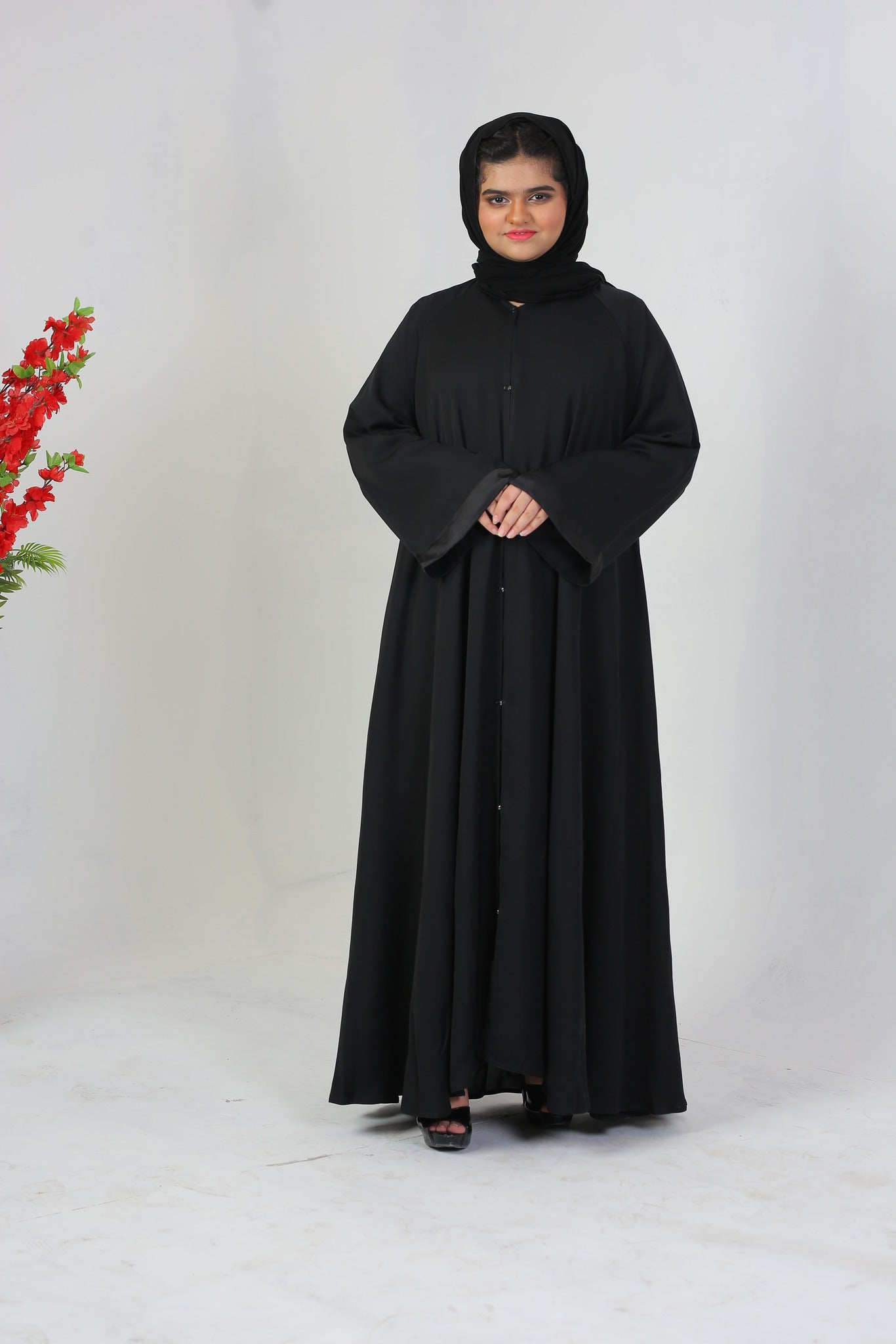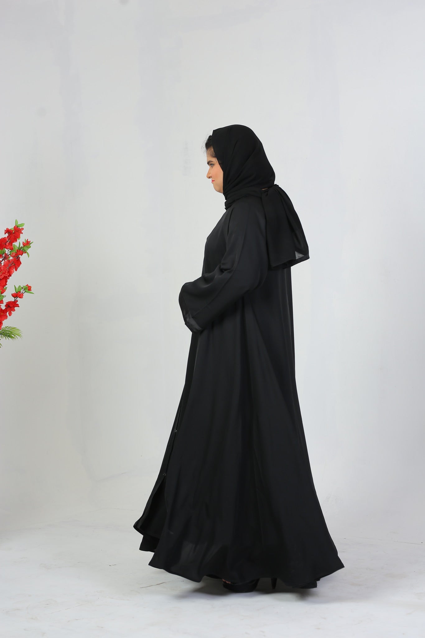Elevate your style with our Front Open Double Flair Abaya in classic black. This front open design adds a touch of modern sophistication to your ensemble. Crafted from imported Nidha fabric, it guarantees both comfort and elegance. Perfect for any occasion, this abaya effortlessly blends timeless design with contemporary flair, making it a versatile addition to your wardrobe.